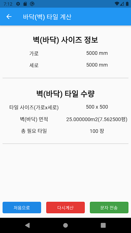 The tile calculator automatically calculates the quantity and size (square meters, pyeong) of the floor tiles and wall tiles by entering the wall and floor size. And additionally, I send the quoted quantity by text message to the person I want.