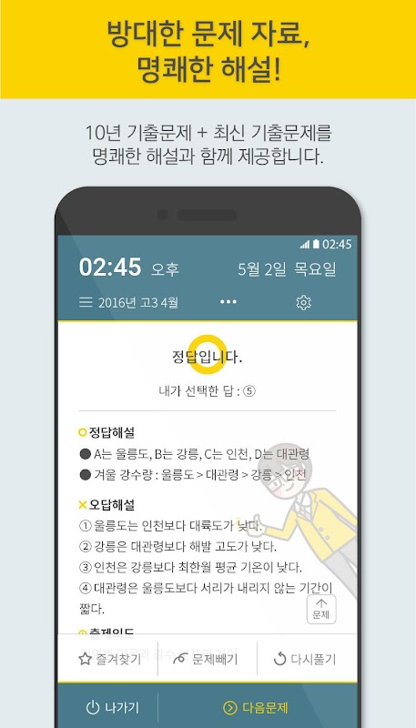 폰만 켜만 자동으로 수능 사탐-한국지리 기출문제를 볼 수 있습니다. 문제푸는게 번거롭다면 한번 쭉 읽고 부담없이 틀리세요. 명쾌한 해설을 보고 한번만 읽어보고 지나쳐도 큰 도움이 됩니다.