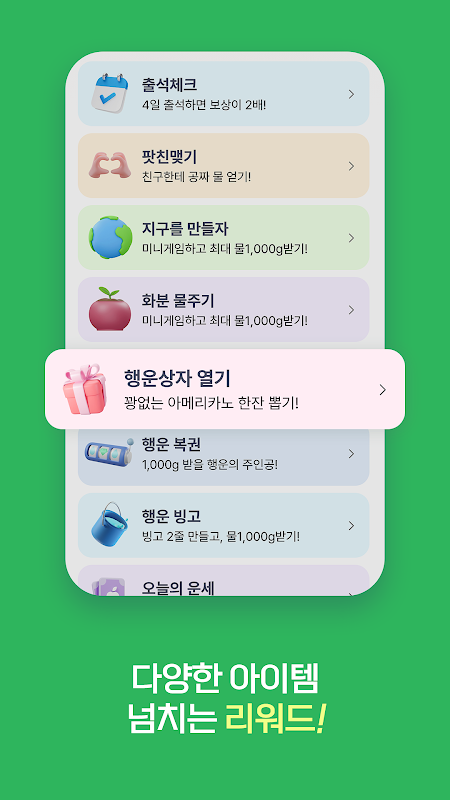 Plant the mobile coupon you want in a flower pot and grow it! You can heal while watching plants grow, and you can exchange for Naver Pay, mobile gift certificates, Starbucks coffee, etc.!
