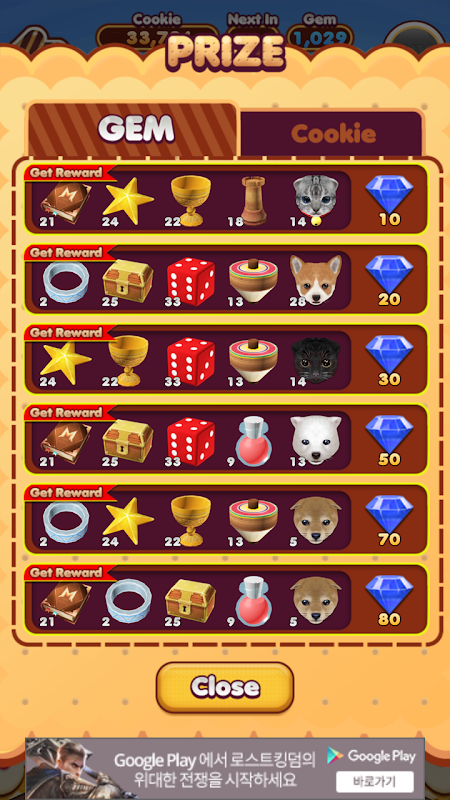 바닥의 쿠키를 떨어뜨리면 자신의 쿠키갯수가 늘어나며 경품을 떨어뜨리면 획득하게 됩니다.