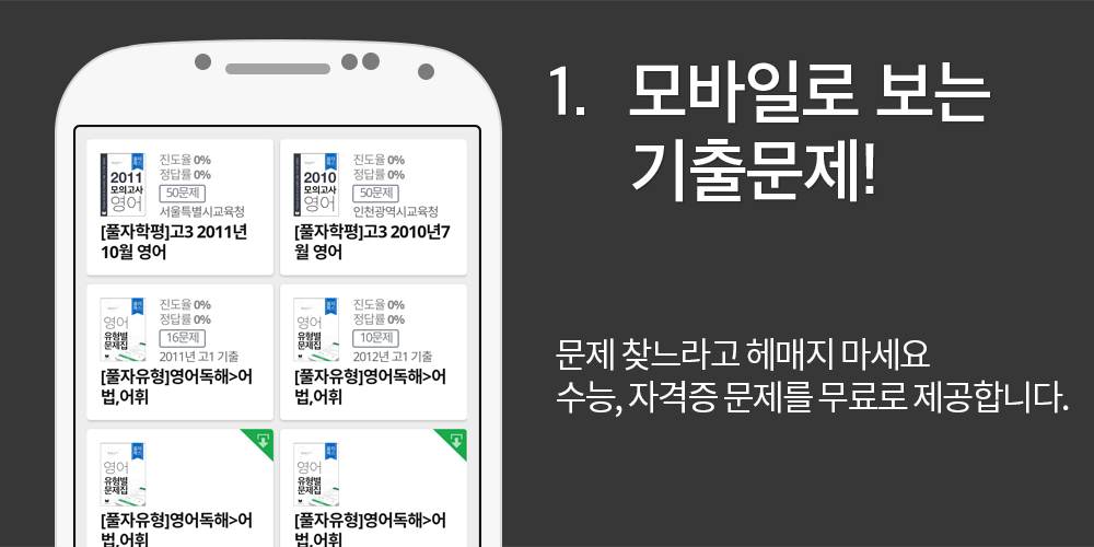 풀자북스는 취준생 자격증 및 입시 대비 고등학교 수능, 학평시험 대비 최신 5개년 기출문제 및 모의고사 문제집을 100% 무료로 모바일에서 바로 다운받아 학습할 수 있는 최적의 학습환경을 제공합니다.