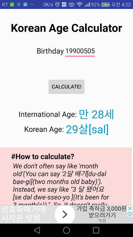 Korean Age is different from other countries. We made this app for understanding how Korean age is.