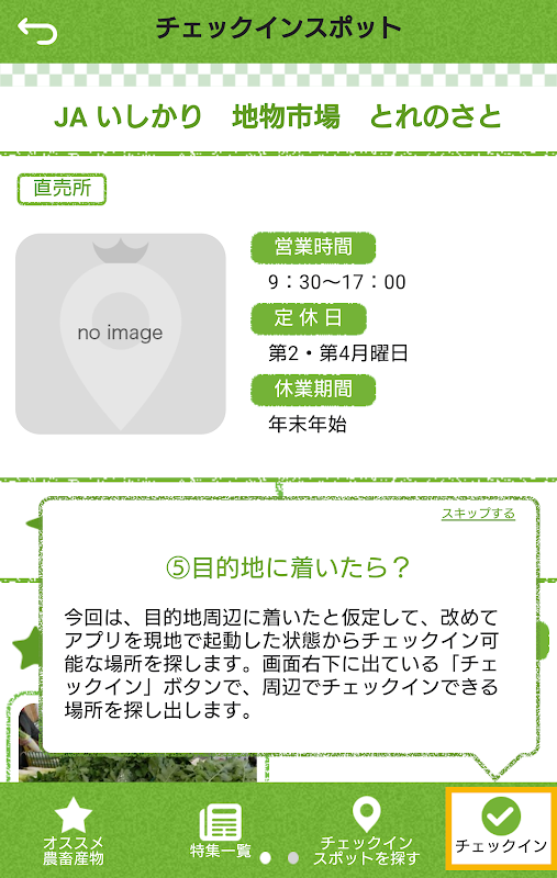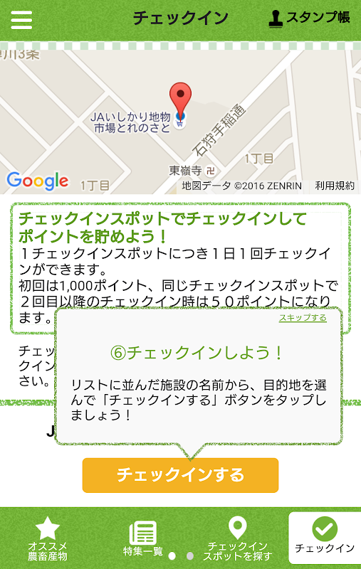 北海道内の直売所やJA北海道グループの関連施設などの “チェックインスポット”を探し出すことがこのアプリの第一歩。