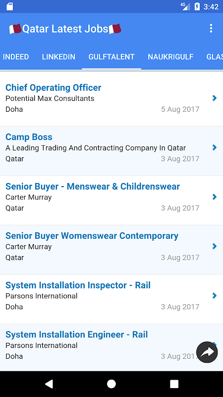 QATAR Latest Jobs App is a one-stop destination for jobseekers and professionals who are looking for either QATAR job vacancies for freshers or experienced jobs, or who are looking to land the career/dream job, specifically in QATAR, Doha, Abu az Zuluf, Abu Thaylah, Ad Dawhah al Jadidah, Al `Arish, Al Bida` ash Sharqiyah, Al Ghanim, Al Ghuwariyah, Al Hilal al Gharbiyah, Al Hilal ash Sharqiyah, Al Hitmi, Al Jasrah, Al Jumaliyah, Al Ka`biyah, Al Khalifat, Al Khor, Al Khawr, Al Khuwayr, Al Mafjar, Al Qa`abiyah, Al Wakrah, second city, Al `Adhbah, An Najmah, Ar Rakiyat, Al Rayyan, Ar Ru'ays, As Salatah, As Salatah al Jadidah, As Sani`, As Sawq, Ath Thaqab, Dukhan, Ras Laffan Industrial City, Umm Bab, Umm Sa'id, Umm Salal Ali, Umm Salal Mohammed.