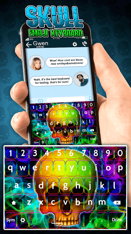 💀🖤💀 It's a must-have mobile app for lovers of horror stuff, because no “emoji keyboard” can give you such thrills as our fantastic skull theme! So, if you want to make your phone coolest among your friends, just grab this “black skull” keyboard skin! Enjoy typing, download 💀Skull Emoji Keyboard💀, change “keyboard background” and feel the surge of excitement every time you start tapping keyboard symbols, fonts and using “hell skull” keyboard stickers. 💀🖤💀