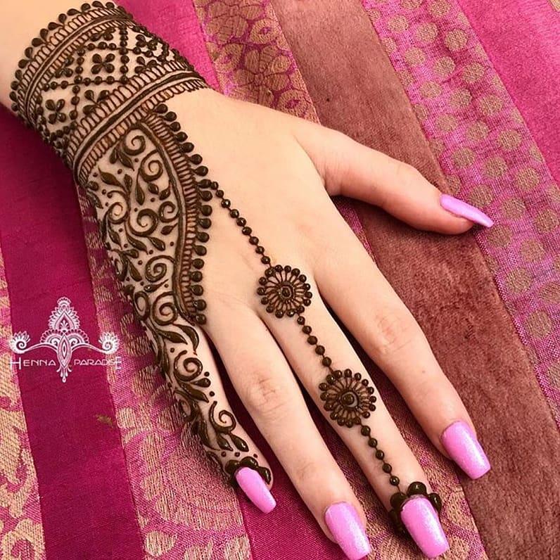 These dainty heena designs are very elegant and simple to apply and can be worked with in matter of minutes. These are usually applied by females ranging from Indian brides (dulhans), saali (sisters of groom), Pakistani saas (mother of groom) for Asian bridal makeup. These can vary across cultures.