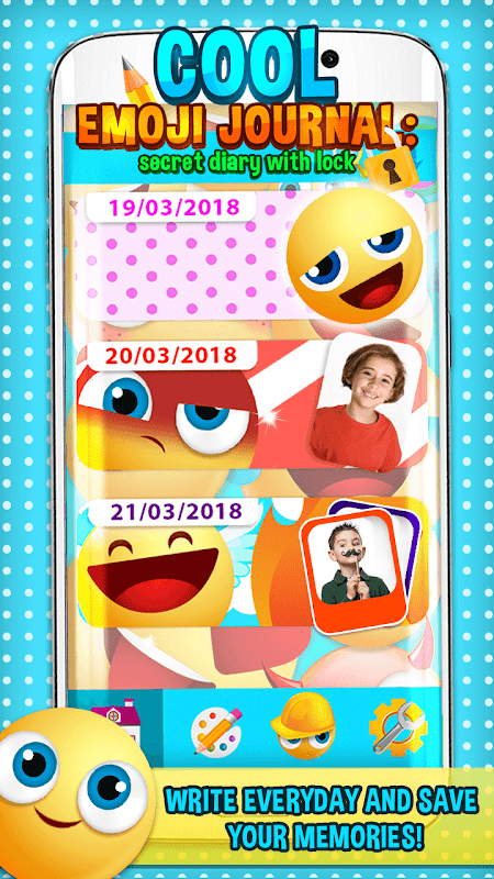Save easily all your secrets and relax because they will be safe with a secret password in this “diary with password”. Create your “task calendar” with the sections like “things to do today” or “events this weekend”, or add you cool selfie pictures to make a colorful “photo diary”. You can also “add reminder” for the lottery where you can get amazing new stuff every day. A lot of crazy emoticons and emoji are waiting for you! Just be creative and “design your own diary”! Download now this 😎Cool Emoji Journal: Secret Diary With Lock😎 and you will never regret it!
