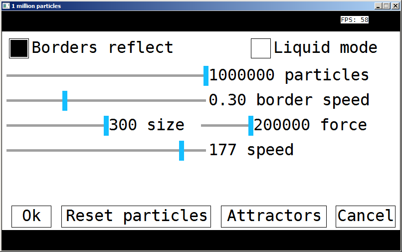 Chose any number of particles between 10000 and 1 million. Optimized for quad core CPUs, on mid end devices you can get over 10 FPS with 1 million particles on screen. You can move them with your fingers (the brush size is pressure sensitive, if your device supports it), and/or you can set attractors that will attract or repulse the particles. You can set up as many attractors as you want, so long as the number is under 50.