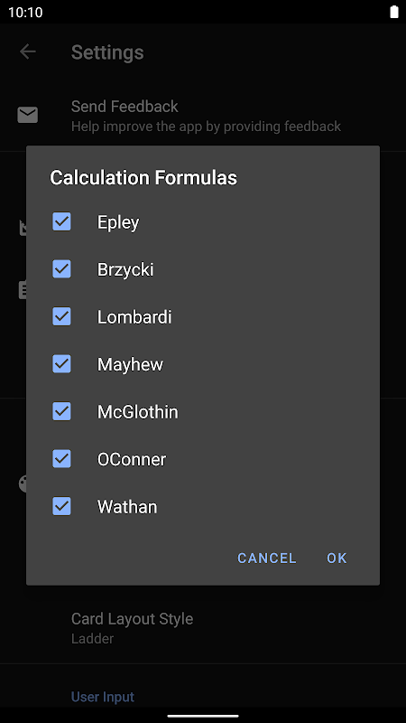 There are many 1 Rep Max formulas to choose from: Epley, Brzycki, Lombardi, Mayhew, McGlothin, OConner, Wathan. You can choose just a single formula or get an average of the ones you select.