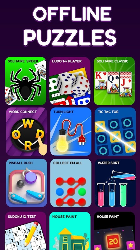 Many Offline Games in 1 App! Play your favorites: Puzzle Games, 2 Player Games!