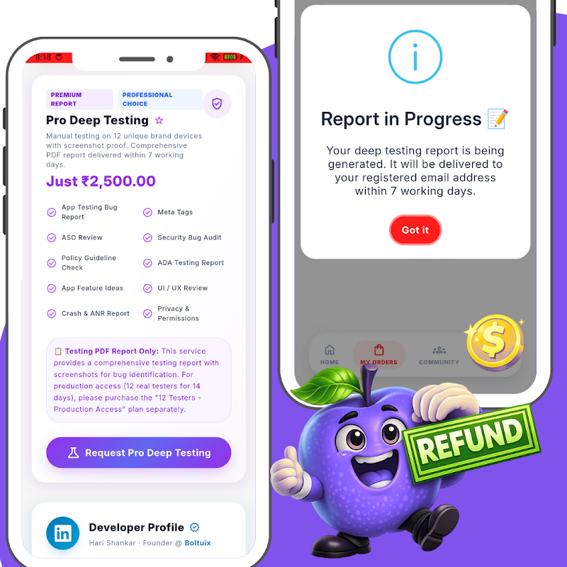 Pro users receive detailed deep testing reports in PDF format. These reports include bug summaries, issue severity, reproduction steps, and tester environment details, making it easier for developers and teams to understand issues and fix them faster.