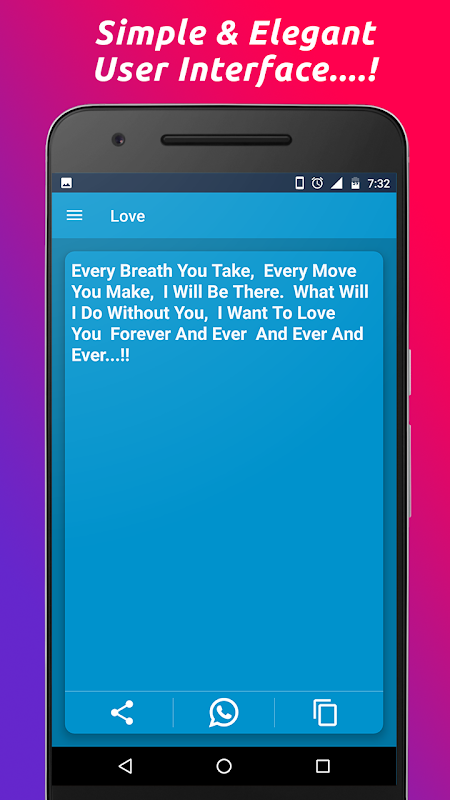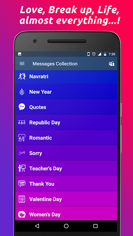 "175000+ message Collection" app consists Message categories from LOVE to BREAK-UP, BIRTHDAY to CONDOLENCE, GOOD MORNING to GOOD NIGHT, MOTHER'S DAY to FATHER's DAY, SORRY to THANK YOU, MARRIAGE to ANNIVERSARY, EID to DIWALI, NEW YEAR to CHRISTMAS and many more. The app contains more than 42+ categories and adding more day by day.