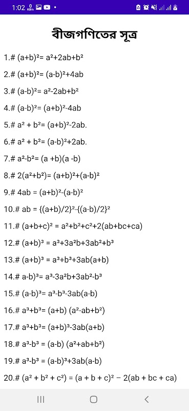 This app will play an important role in learning all the formulas of mathematics in a simple technique and in a short time. Here are all the formulas of algebra, such as algebra, arithmetic, geometry and all the formulas and conclusions of mathematics. Will serve as important learning materials for students and job seekers. To do well in mathematics, you need to practice all the formulas over and over again. This app will serve as a helpful notebook for practicing formulas. All the mathematical formulas are given very nicely.