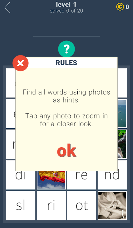 Each photo contains a clue. Tap the picture to zoom in for a closer look, and then find the word that is in any way related to the photo. Some answers are straightforward, some are quite tricky. Enjoy this addictive brainteaser!