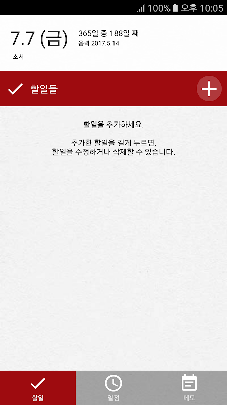 - 달력에서 날짜를 선택하면 날짜 별 할일, 일정, 메모를 적어둘 수 있는 화면이 열립니다.