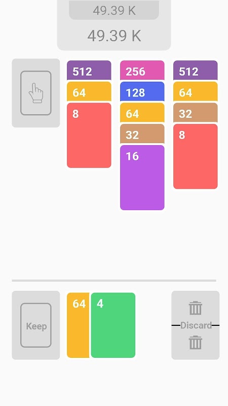 Stack the cards by dragging the cards below. Two cards on top of each other with same value will be merged into one. When 2048 is created all the cards in the column will be cleared.