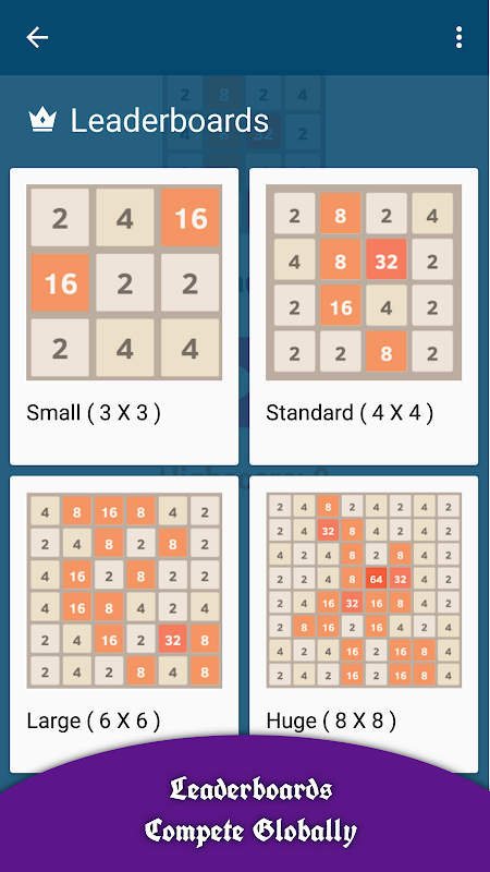 ✔️ Classic (4x4) board, small (3X3), large (6X6), huge (8X8).