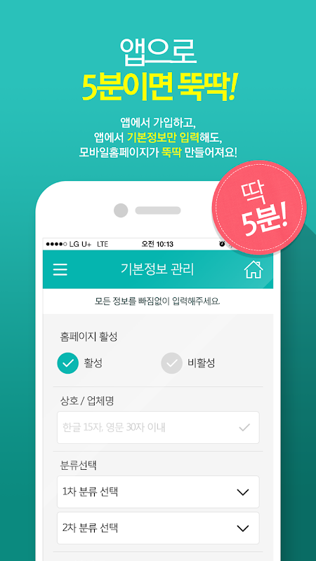 1) 업종/개인에 대한 제약 없이, 무료로 모바일 홈페이지를 단 5분만에 제작