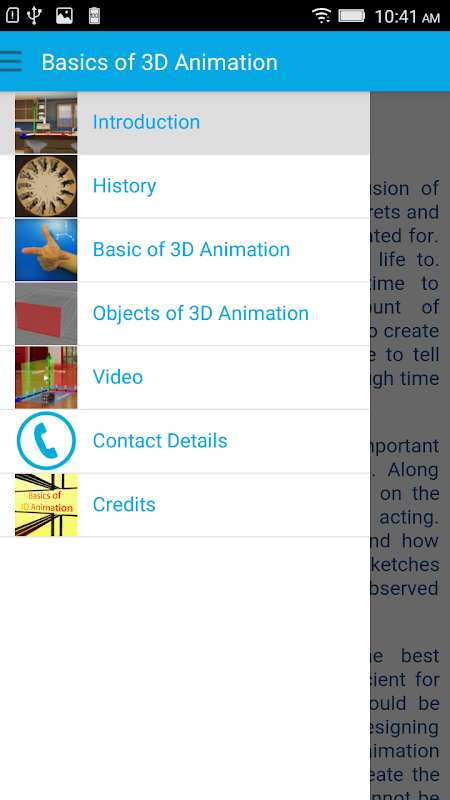 This mobile app provides information about Basics of 3D Animation course that can be used for video capturing of real world which is full of 3D objects and then generate series of 2D images to simulate motion in the form of output.