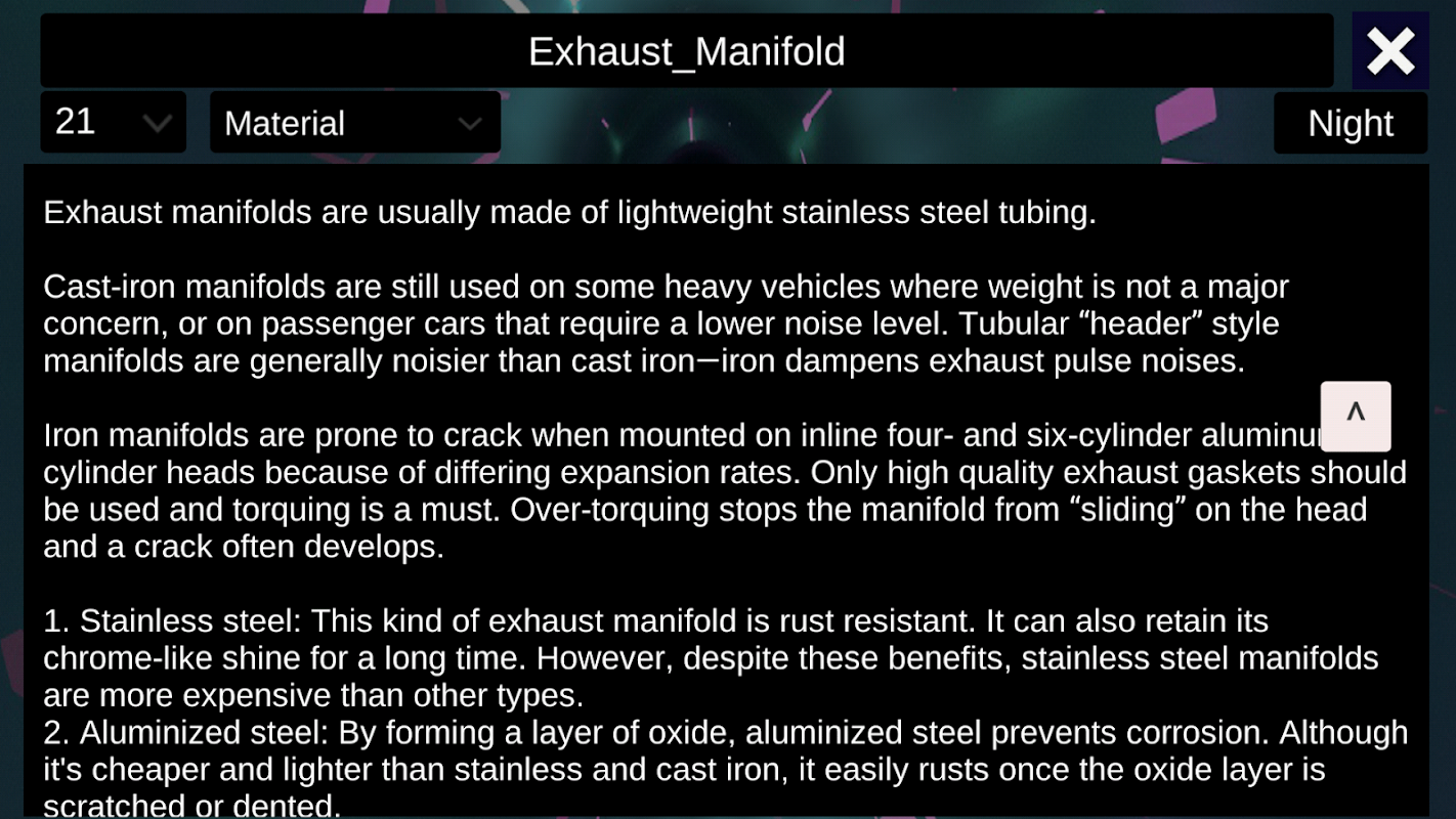 2. Information of each 3D engine parts and other mechanism. The Information is categorized under the following: