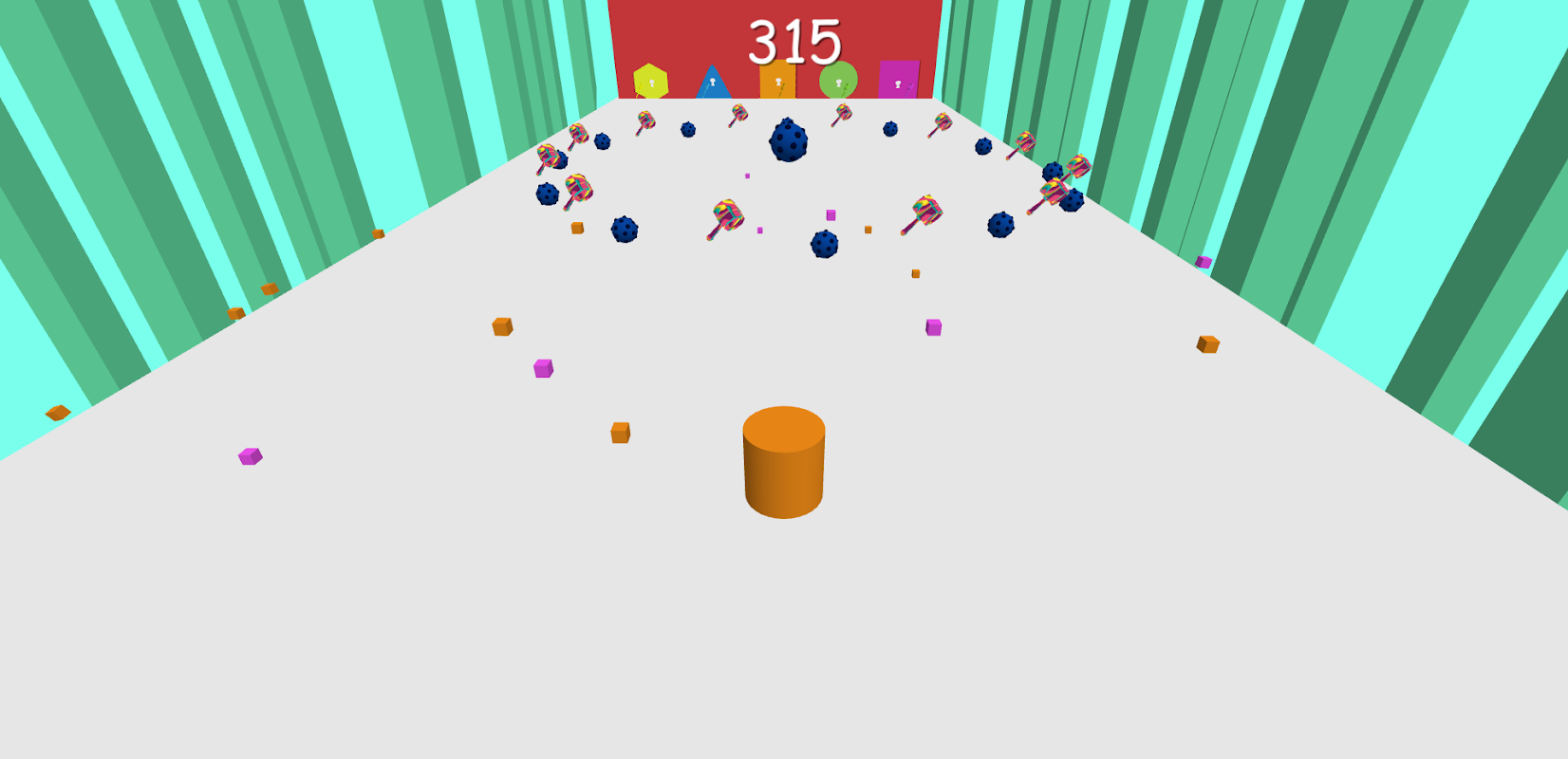 Each time you hit the hammer your shape will be changed to one of these six shapes (Cube, Sphere, Cylinder, Pyramid, Cone, Hexagon) so, to stay alive you have to do two main things, firstly, avoid obstacles and secondly enter the suitable gate based on your shape after collecting the key of it. The distance you reach will be your score and you can see your rank using the leaderboard, you have to keep in mind that your shape's speed will be increased over time. This game is simple but it needs focusing.