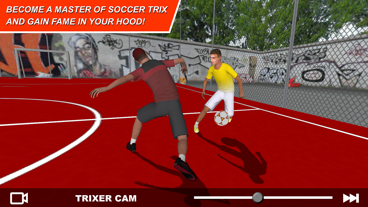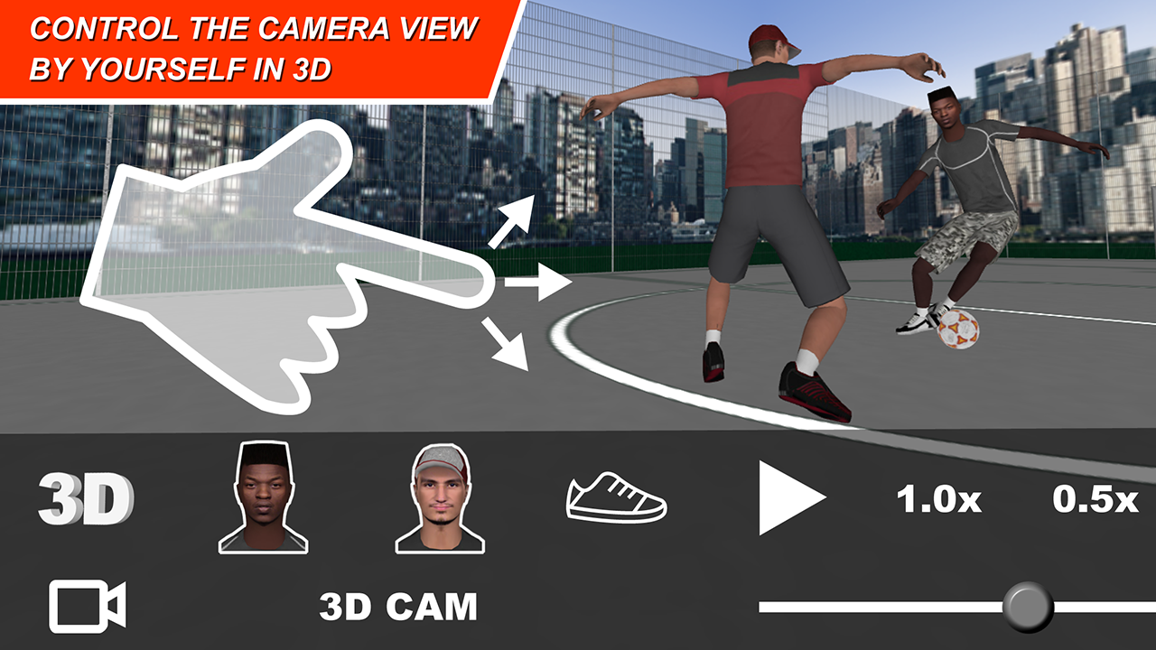 Each trick contains a detailed tutorial to learn the soccer tricks step by step. Experience stunning features like touch control of the 3D camera and multiple perspectives on the trick demonstration. Imagine to jump into the view of the ball leader, the foot close-up or the defending opponent. Watch in slider-mode, slow motion or even super slow motion. Once you've trained a trick, show your new feint, step-over, panna or flip move in a match and share it with your peers using social media sharing options.