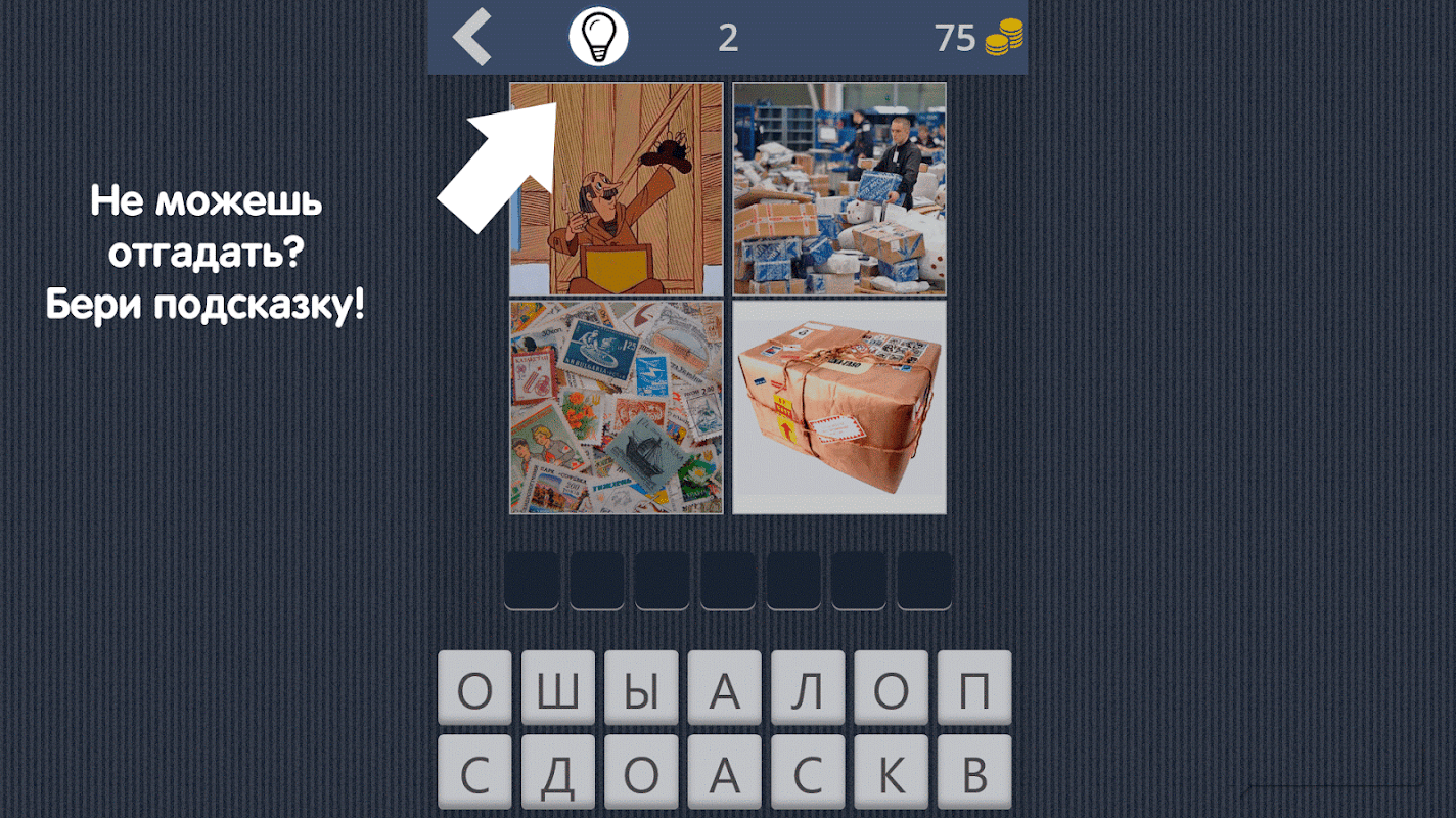 На сложных уровнях чтобы угадать слово по фоткам можно брать подсказки, а также можно попросить помощи у друга или родственника.