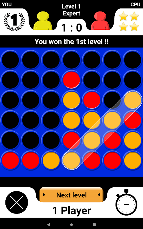 1 Player mode allows you to play against the computer. The difficulty increase with the level.