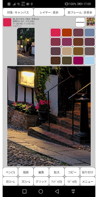 Basic functions such as fill, line, rectangle, circle, flip, rotate, enlarge, copy, paste, dropper, and undo are available.