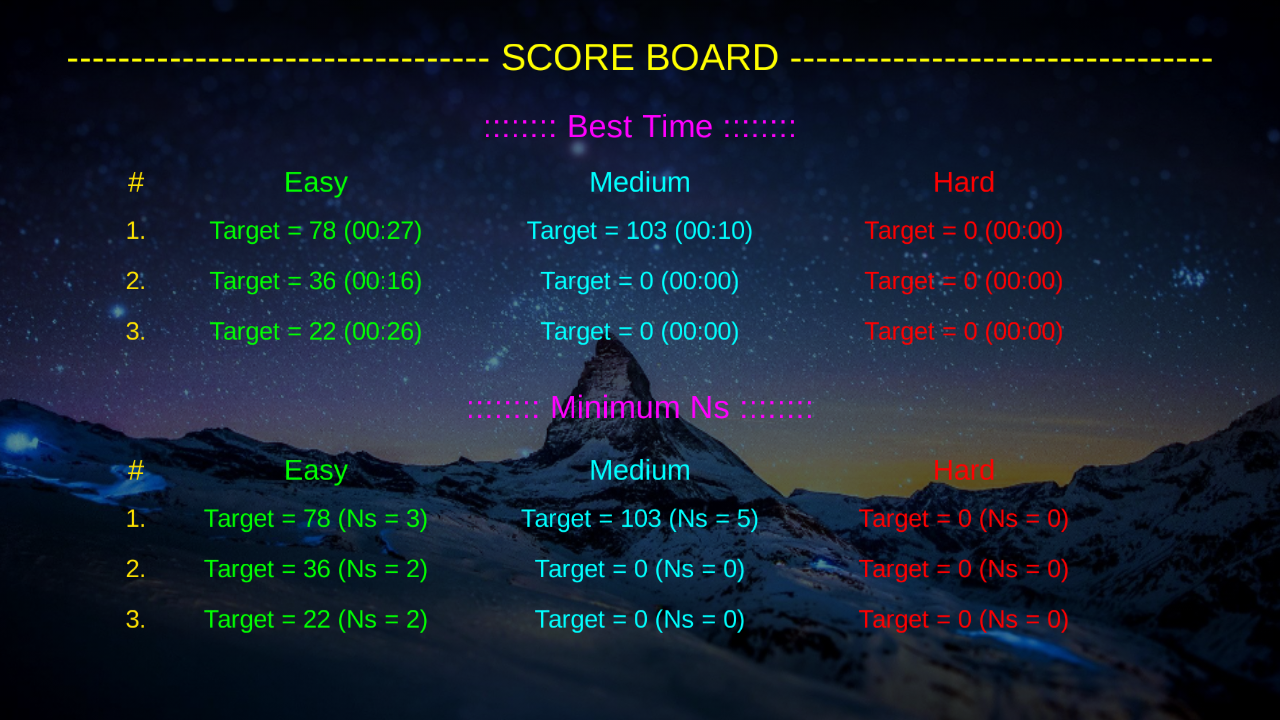 - For all levels, Best Time & Minimum Ns used will be recorded for each Target Number you reach.