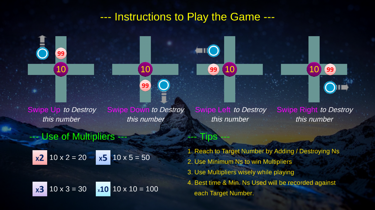 1. Easy: In Easy level, your Target Number will be between 10 to 99 numbers. Ns' speed will be less.
