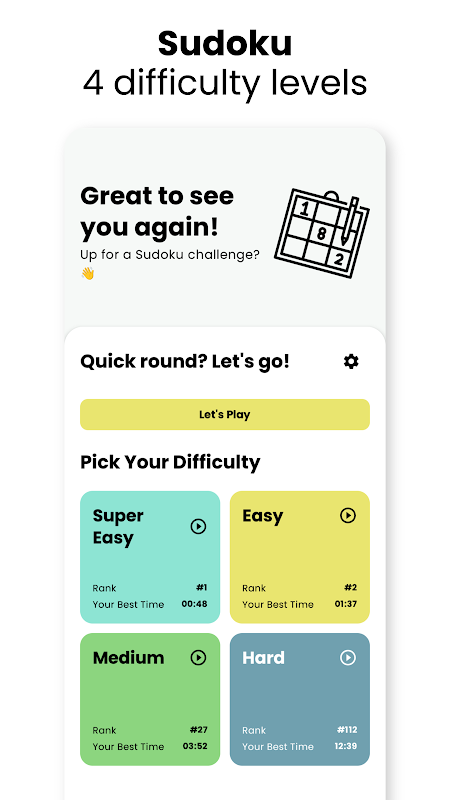 Designed with all ages in mind, our clean, user-friendly interface makes sudoku enjoyable for both beginners and seasoned players. Customize the experience to your skill level with adjustable difficulty settings. Now, with a super-easy sudoku level, kids and beginners can also enjoy the classic sudoku fun.