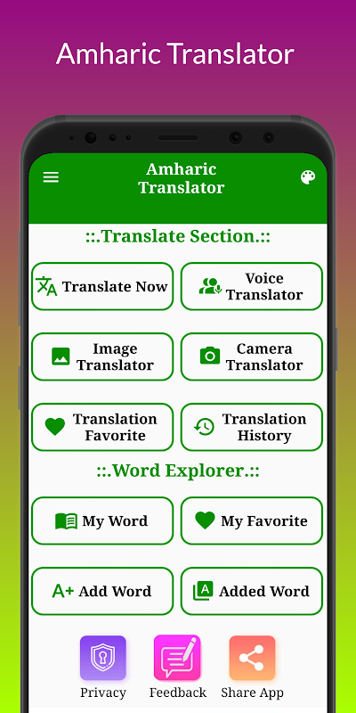 👉 Introducing Amharic Translator, the ultimate educational app developed by World Languages Translator Developer, designed to facilitate language learning and translation. With a strong focus on the Amharic language, this app serves as a valuable resource for users looking to enhance their linguistic skills and bridge communication barriers. Whether you're a beginner or an advanced learner, you’ll find everything you need to unlock the world of Amharic with this innovative app.