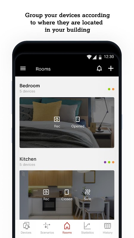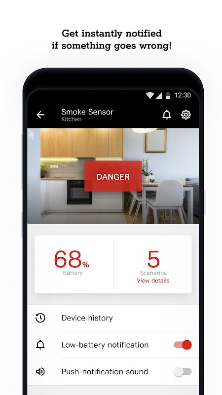 • PUSH-notifications to your smartphone in case of doors opening, movement, smoke, flood detection