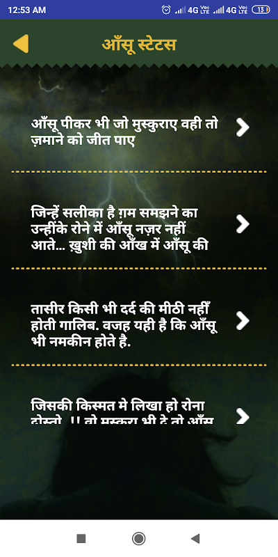 This app contains great collection of Aansoo Shayari & Aansoo Status.