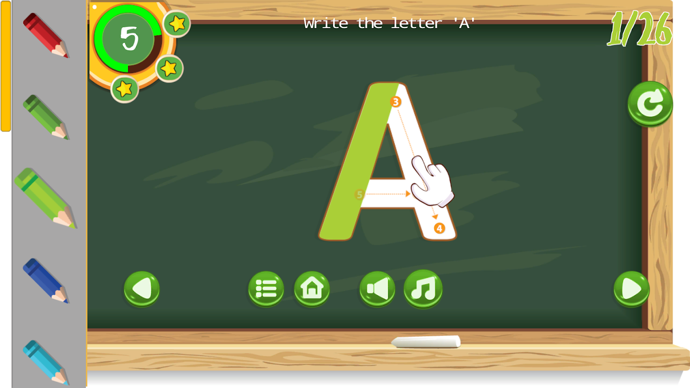 This menu scene will assist kids to write capital letter from A to Z. The application guide also where to start to touch and write.