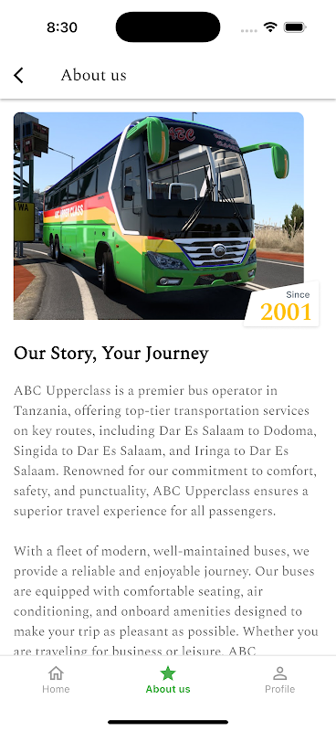 Bus booking app for ABC Upperclass routes across Tanzania.