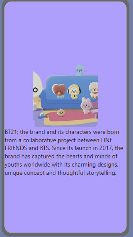 This APP is all about BT21. Which I like very much so I made it. This is for Entertainment Purpose only. This app will help people to gain knowledge about BT21.