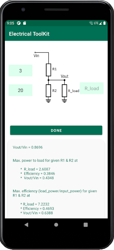 3. Loading effect : Loading effect when load is added in a voltage divider circuit, what load gives the maximum load power and which load gives the maximum efficiency.