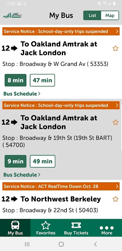 Plan, ride & connect with Alameda-Contra Costa Transit District (AC Transit), using the official mobile app for bus travel in the Bay Area in California. User-friendly features include real-time arrival predictions, mobile ticketing options and direct connection to customer service. In addition, the AC Transit Official Mobile App can be used to locate bus stops, bookmark favorite lines and submit lost and found details. Download the official mobile app today and enhance your transit experience with AC Transit.