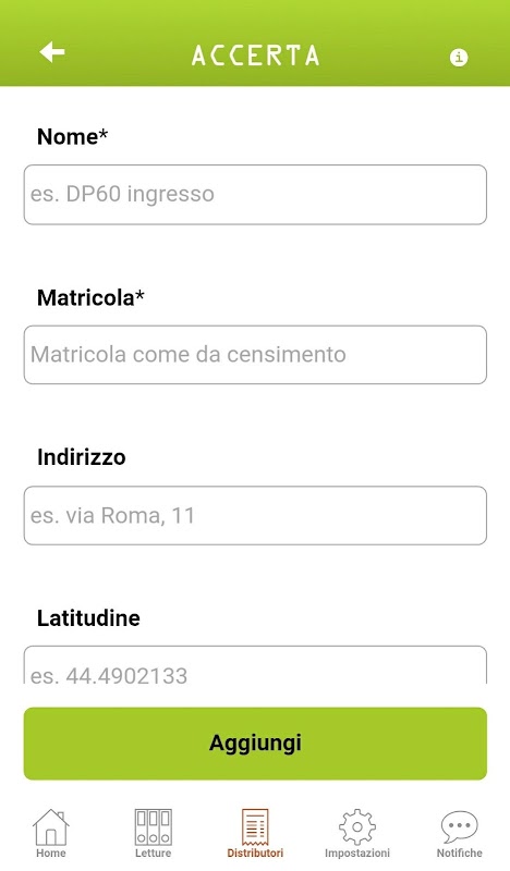 Once you installed the app on your device ENSURES, a brief tutorial guide the user through all of the features in this version, which first involves the insertion of data distributors to which the user is the owner or lessee.