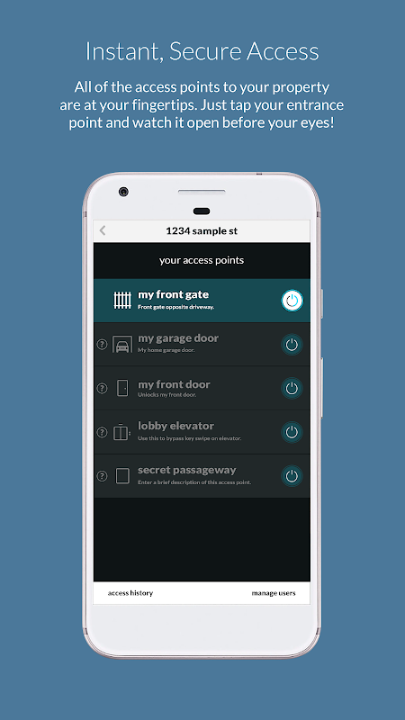 Think of ParqEx Access+ provides you with Virtual Gate, Garage, Door, Electronic Lock Opener (Requires installation and configuration of ParqEx Access+ hardware). This single app can control them all.