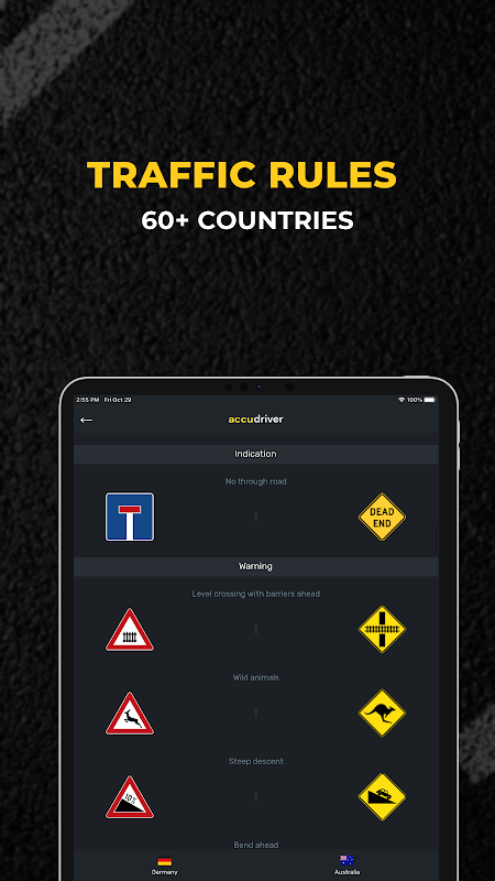 Accudriver helps drivers who are going abroad to understand real traffic rules and road signs differences and see it in a clean visual format with one click. Also, you can learn the traffic rules and signs of a country separately.