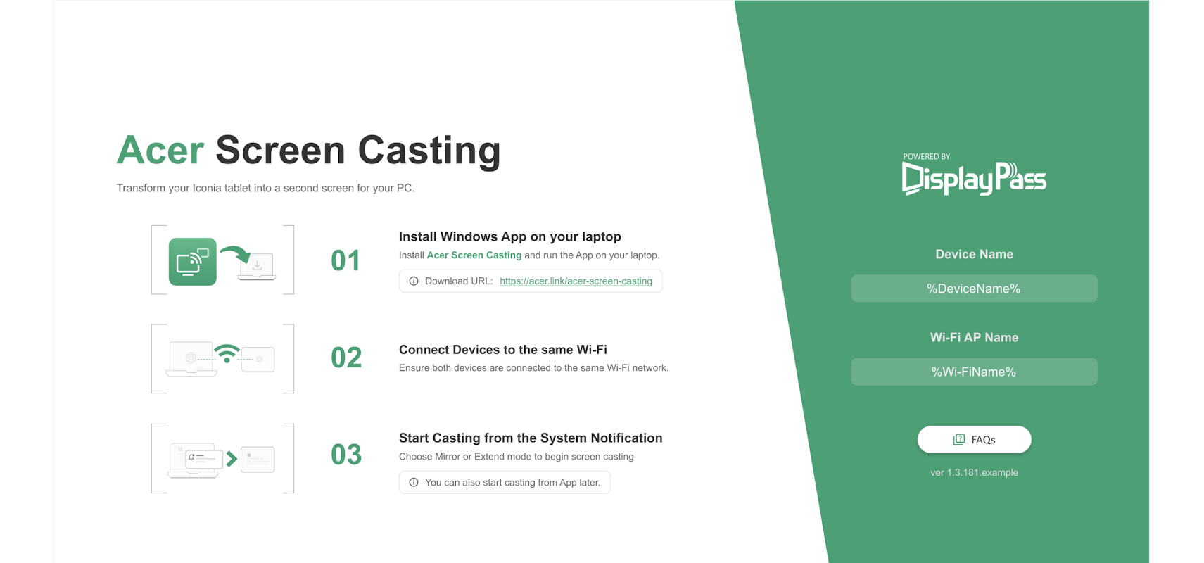 1. Install this application on your tablet and install the Windows version application on your computer (download site https://acer.link/acer-screen-casting)