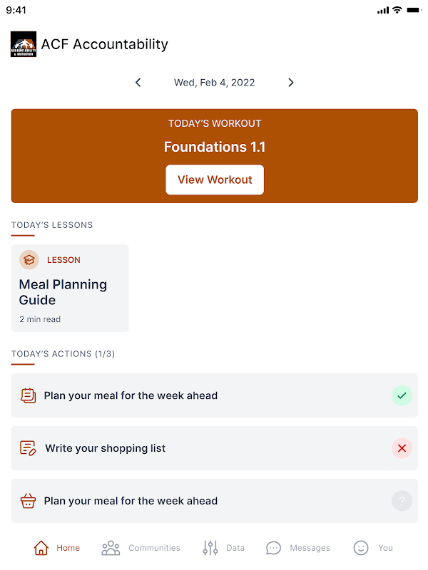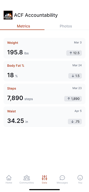 The ACF Accountability app is designed for clients of trainers who have enrolled in the ACF Accountability program. The app will send push notifications and prompt clients to answer yes/no question in regards to comply with healthy habits sent by the trainer. Clients and trainers can track progress and help the client to improve overall health.