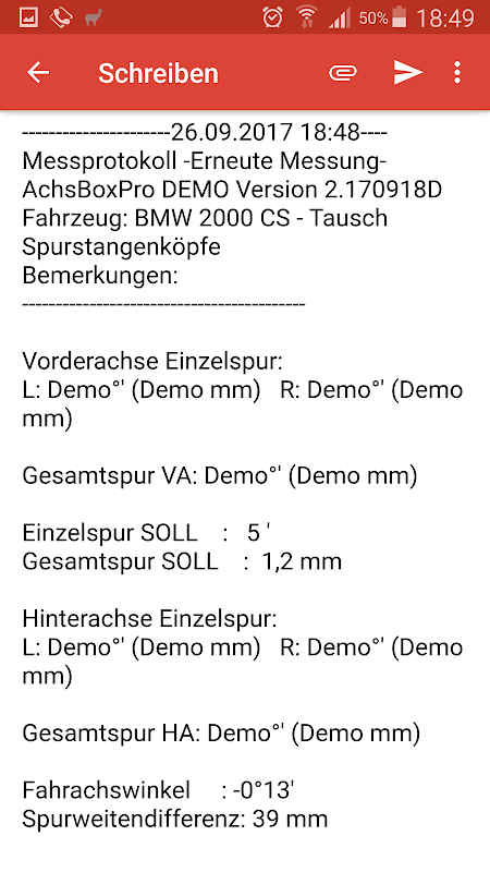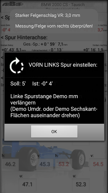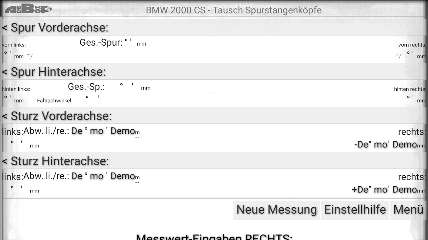 With AchsBoxPro the lane and the lintel (not in the demo) can be measured on nearly every vehicle. The app allows the expert and hobby-driven screwdriver interested in an axle measurement * in your own garage.