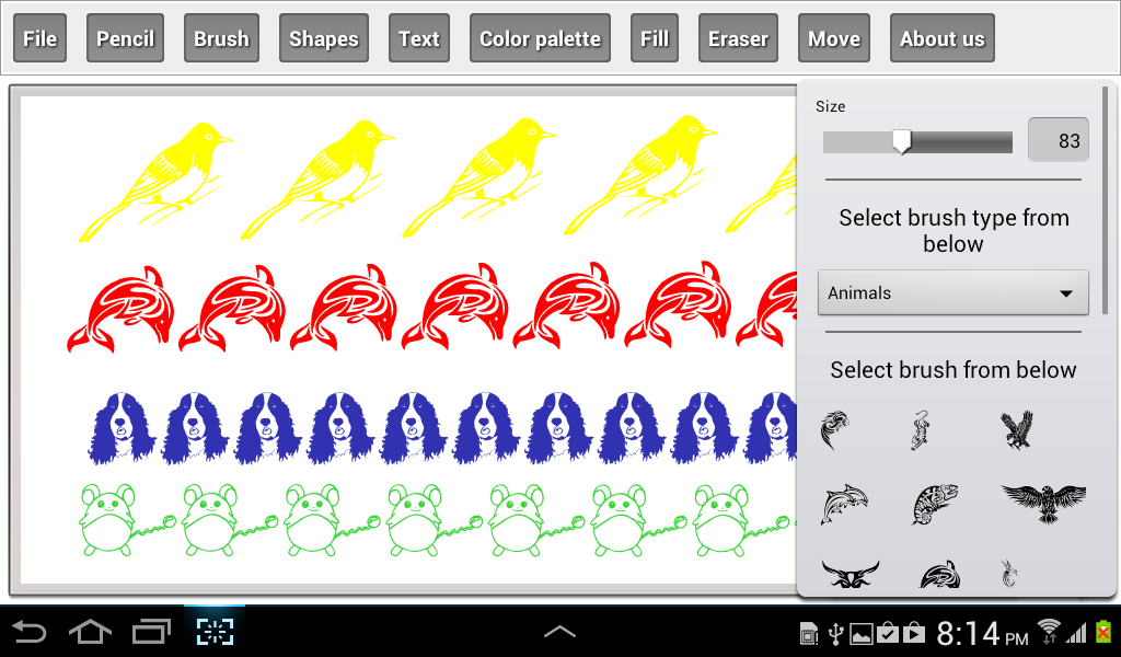 Brush button - It consist of 24 brush templates with 624 Brushes. Choose any brush from this 624 brushes of required size and swipe finger on the screen to make your imagination come live on the screen.