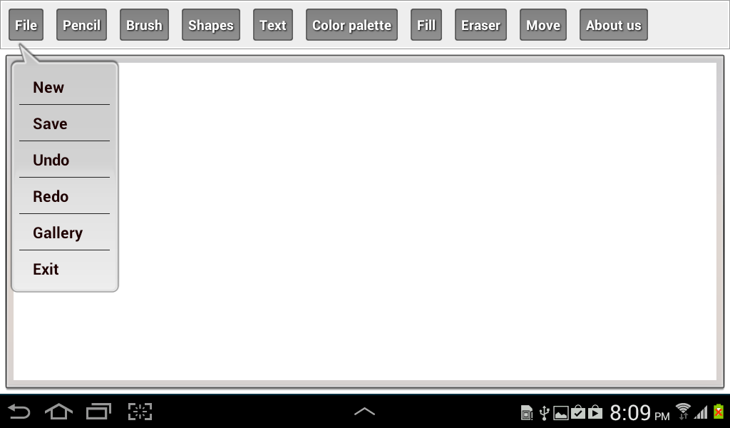 File button - It provide option like New, Save, Undo, Redo, Gallery and Exit.Using Gallery option user can view his painting and can