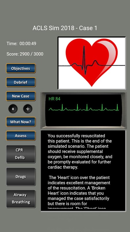 In addition to providing a graphical and dynamically changing simulation, the app provides a detailed record of your resuscitation, scores your performance, and provides detailed feedback on your management. Thus it is a complete learning environment.