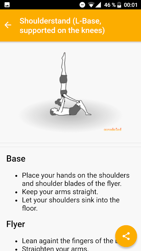 The poses form the base of the hierarchy of this database. All poses can be filtered by the position of the base and the flyer and their contact point. Every pose has an illustration designed by ©acrodicted and a section with a description of what to do for the base, flyer.
